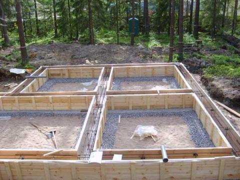 Плитный – самый надежный тип, пригодный для возведения толстостенного дома на подвижных глинистых либо торфяных почвах. Применяется песчаная подсыпка толщиной до 0,3 метра, на которой отливается цельная железобетонная плита. Она должна быть несколько больше периметра здания. Плита «плавает» на грунте, состояние которого не влияет на прочность здания. Этот вариант не слишком дорог, так как исключены земляные работы. Ограничением является невозможность закладки на участке с большим уклоном и сложность оборудования подвала.